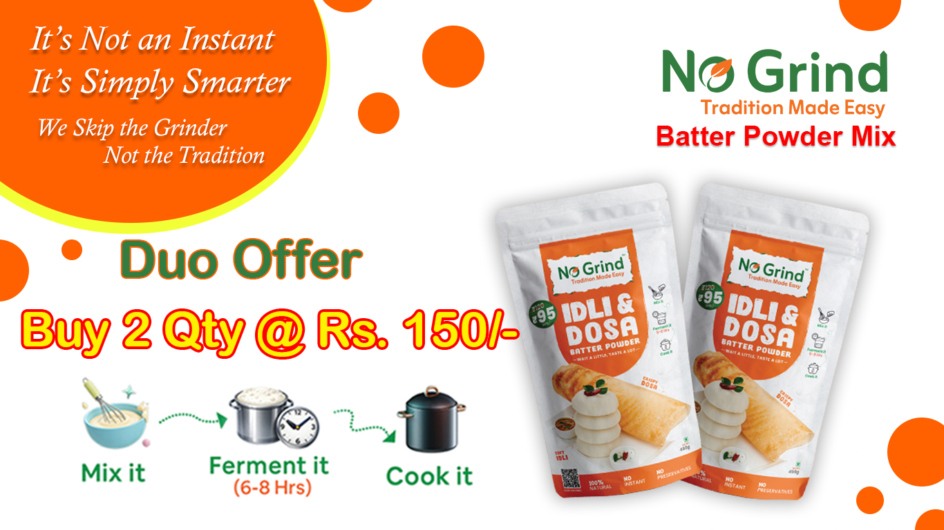 Experience soft, fluffy Idlis and perfectly crispy Dosas with No Grind™ — a 100% natural, preservative‑free Idli & Dosa Batter Mix made using a traditional recipe. Crafted from premium rice, urad dal, and fenugreek, our mix delivers authentic South Indian taste without soaking, grinding, or long preparation. This naturally fermenting blend ensures healthy, homemade breakfast anytime. Just mix with warm water, ferment, and cook — no machines, no chemicals, no compromise on taste....