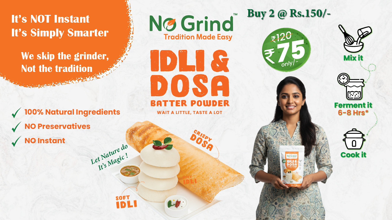 Experience soft, fluffy Idlis and perfectly crispy Dosas with No Grind™ — a 100% natural, preservative‑free Idli & Dosa Batter Mix made using a traditional recipe. Crafted from premium rice, urad dal, and fenugreek, our mix delivers authentic South Indian taste without soaking, grinding, or long preparation. This naturally fermenting blend ensures healthy, homemade breakfast anytime. Just mix with warm water, ferment, and cook — no machines, no chemicals, no compromise on taste....